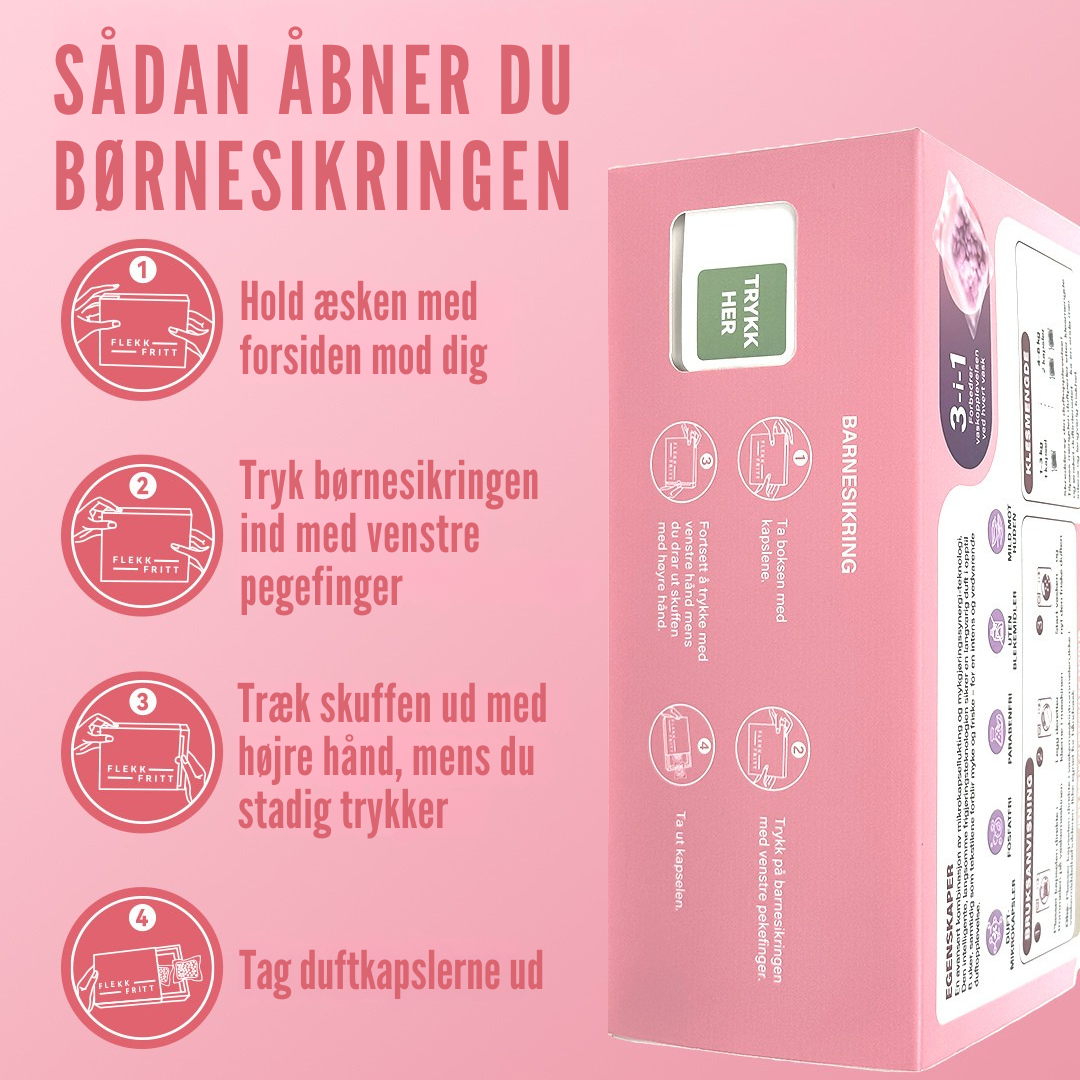Ja, Flekkfrit duftkapsler kan bruges i alle almindelige vaskemaskiner. Kapslerne lægges direkte i tromlen sammen med tøjet og opløses under vask – både i koldt og varmt vand. De skal ikke åbnes eller lægges i sæbeskuffen. For det bedste resultat anbefales det at følge doseringstabellen (1 kapsel til små vaske, 2 kapsler til normal vask, 3 kapsler til store vaske). 👉 Husk: Opbevares utilgængeligt for børn og skal altid håndteres med tørre hænder.